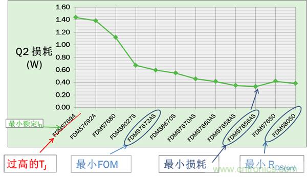 對于Q2,VIN= VINMAX時(shí)損耗最大。圖3所示的12個(gè)器件中,F(xiàn)DMS7656AS有最低的最大損耗。但由于Q2 寄生參數(shù)會影響Q1的 開關(guān)損耗, 最小Q2 損耗通常并不意味著最佳的總能效。必須比較Q1及Q2的總功耗來找到最佳的Q2以實(shí)現(xiàn)最高能效。
