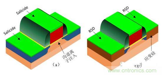 隨著MOS器件的特征尺寸不斷縮小到90nm及以下時(shí),短溝道效應(yīng)中的器件亞閾值電流成為妨礙工藝進(jìn)一步發(fā)展的主要因素,盡管提高溝道摻雜濃度可以在一定程度上抑制短溝道效應(yīng),然而高摻雜的溝道會(huì)增大庫(kù)倫散射,使載流子遷移率下降,導(dǎo)致器件的速度降低,所以僅僅依靠縮小MOS器件的幾何尺寸已經(jīng)不能滿足器件性能的提高,需要一些額外的工藝技術(shù)來(lái)提高器件的電學(xué)性能,例如應(yīng)變硅技術(shù)。應(yīng)變硅技術(shù)是通過(guò)外延生長(zhǎng)在源漏區(qū)嵌入應(yīng)變材料使溝道發(fā)生應(yīng)變,從而提高載流子遷移率,最終提高器件的速度。例如NMOS的應(yīng)變材料是SiC,PMOS的應(yīng)變材料是SiGe。另外,隨著源漏的結(jié)深的短減小,源漏擴(kuò)散區(qū)的厚度已經(jīng)不能滿足形成Salicide的最小厚度要求,必須利用新技術(shù)RSD(Raise Source and Drain)技術(shù)來(lái)增加源漏擴(kuò)散區(qū)的厚度。RSD技術(shù)是通過(guò)外延技術(shù)生長(zhǎng)在源漏區(qū)嵌入應(yīng)變材料的同時(shí)提高源漏擴(kuò)散區(qū)的厚度。如圖1.15(b)所示,是采用應(yīng)變硅和RSD技術(shù)的MOS管結(jié)構(gòu)圖。