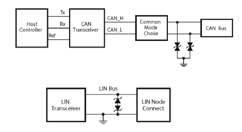 下圖所示的是 CAN 和 LIN 總線的典型 ESD 保護方案。由于 CAN 總線是雙通道電路,最常見的解決方案是采用一個雙通道二極管陣列。LIN 總線為單通道,因此它的 ESD 解決方案采用的是分立 ESD 二極管或多層壓敏電阻。