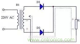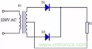 半波整流電路見下圖。其中B1是電源變壓器,D1是整流二極管,R1是負載。B1次級是一個方向和大小隨時間變化的正弦波電壓,波形如圖2所示。0~π期間是這個電壓的正半周,這時B1次級上端為正下端為負,二極管D1正向導通,電源電壓加到負載R1上,負載R1中有電流通過;π~2π期間是這個電壓的負半周,這時B1次級上端為負下端為正,二極管D1反向截止,沒有電壓加到負載R1上,負載R1中沒有電流通過。在 2π~3π、3π~4π等后續周期中重復上述過程,這樣電源負半周的波形被“削”掉,得到一個單一方向的電壓,波形如圖3所示。由于這樣得到的電壓波形大小還是隨時間變化,我們稱其為脈動直流。
