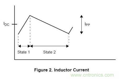 因此,當電感上的電壓為正時(狀態1),電感上的電流就會增加;當電感上的電壓為負時(狀態2),電感上的電流就會減小。通過電感的電流如圖2所示: