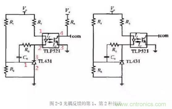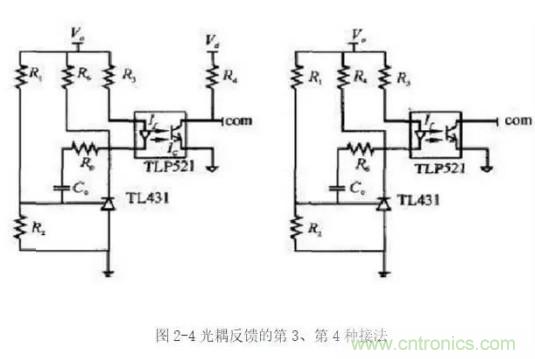 圖2-3所示接法的工作原理是:當輸出電壓升高時,原邊電流If增大,輸出電流Ic增大,由于Ic已經超過了電壓誤差放大器的電流輸出能力,com腳電壓下降,占空比減小,輸出電壓減小;反之,當輸出電壓下降時,調節過程類似。