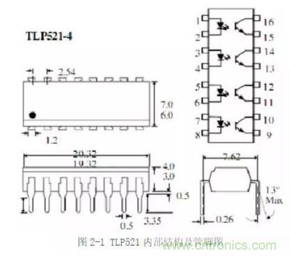 常用于反饋的光耦型號有TLP521、PC817等。這里以TLP521為例,介紹這類光耦的特性。圖2-1所示為光耦內部結構圖以及引腳圖。