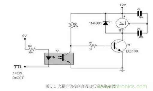 光耦(opticalcoupler)亦稱光電隔離器、光耦合器或光電耦合器。它是以光為媒介來傳輸電信號的器件,通常把發光器(紅外線發光二極管LED)與受光器(光敏半導體管)封裝在同一管殼內。當輸入端加電信號時發光二極管發出光線,光敏三極管接受光線之后就產生光電流,從輸出端流出,從而實現了“電—光—電”轉換。典型應用電路如下圖1-1所示。