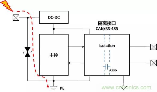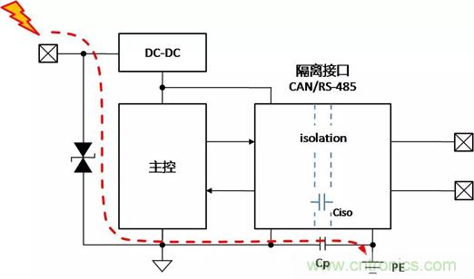 帶隔離通信接口的設備,在不同的使用、安裝狀態下,接口會表現出完全不同的ESD特性,了解設備在不同的使用狀態下,ESD對接口的影響的機理,才能有針對性地增加保護器件,提升隔離接口的ESD能力。下面以帶有隔離CAN或RS-485通信接口為例,對常見的設備狀態下,ESD的作用機理進行分析,并提出相應的改善措施。