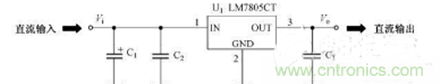 【導(dǎo)讀】電容在穩(wěn)壓電路中的有什么作用呢?在分析電容在穩(wěn)壓電路中的作用中,它有兩類電子元件,一類是本章將要介紹的電容,圖中標(biāo)號為C1、C2、C3;另一類是三端穩(wěn)壓集成電路LM7805,圖中標(biāo)號為U1。LM7805是一種三端穩(wěn)壓集成電路,它可以將電壓值為7~30V的直流輸入信號轉(zhuǎn)為電壓值為5V的直流信號輸出。