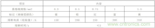 易熔線應(yīng)有明顯的標志,當其熔斷后,其標志仍應(yīng)存在以便于更換。易熔線的熔斷特性如表1所示。