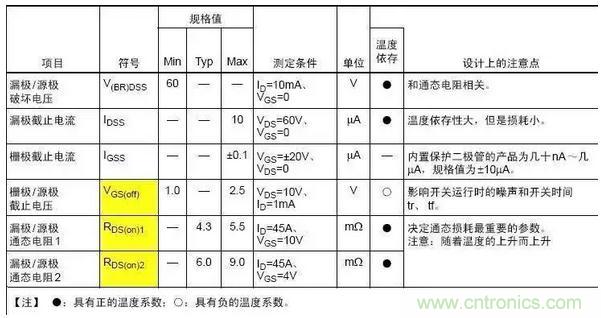 VGS(th)是指加的柵源電壓能使漏極開(kāi)始有電流,或關(guān)斷MOSFET時(shí)電流消失時(shí)的電壓,測(cè)試的條件(漏極電流,漏源電壓,結(jié)溫)也是有規(guī)格的。正常情況下,所有的MOS柵極器件的閾值電壓都會(huì)有所不同。因此,VGS(th)的變化范圍是規(guī)定好的。VGS(th)是負(fù)溫度系數(shù),當(dāng)溫度上升時(shí),MOSFET將會(huì)在比較低的柵源電壓下開(kāi)啟。