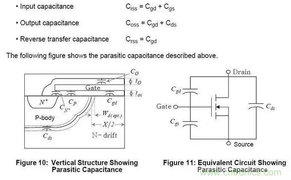 在源極接地的情況下,測(cè)得的漏極和柵極之間的電容為反向傳輸電容。反向傳輸電容等同于柵漏電容。Cres =Cgd,反向傳輸電容也常叫做米勒電容,對(duì)于開(kāi)關(guān)的上升和下降時(shí)間來(lái)說(shuō)是其中一個(gè)重要的參數(shù),他還影響這關(guān)斷延時(shí)時(shí)間。電容隨著漏源電壓的增加而減小,尤其是輸出電容和反向傳輸電容。