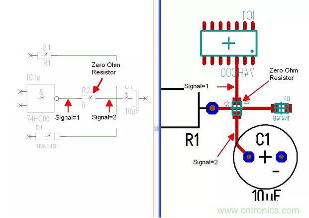 如果老板出于成本考慮,讓你設計一個單面板,也就是說你的元器件的安裝以及走線都只能在一面,你最頭疼的是有些線實在走不過去,必須跨線連接,打倆孔用跳線?如果在研發的時候還可以,但有一天你的設計變成了產品需要大批量生產了,機器折騰起跳線來要比放置一個電阻麻煩的多了,這時候0Ω的電阻就幫你大忙了,根據你的空間,你可以選用0805、0603或0402的電阻。