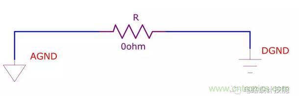 用于信號完整性的模擬地和數字地的單點連接 - 有人說0?跟沒有一樣,干嘛不直接連接上?想象一下如果你在電路原理圖里沒有這個0?的電阻,做PCB Layout的時候就可能忽略這個單點連接的原則,CAD軟件也會亂連在一起,達不到你單點連接的初衷。當然單點連接的時候你也可以用磁珠,我個人的觀點其實連接點的位置選擇好的話,磁珠除了比電阻貴之外,沒有什么好處,實際的操作中你可以用比較小的封裝的0?電阻,比如0402、0201,焊接的時候直接用烙鐵將兩端搭接在一起就可以,連電阻也省了;