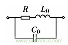同一個(gè)電阻元件在通以直流和交流電時(shí)測(cè)得的電阻值是不相同的。在高頻交流下,須考慮電阻元件的引線電感L0和分布電容C0的影響,其等效電路如圖1所示,圖中R為理想電阻。由圖可知此元件在頻率f下的等效阻抗為
