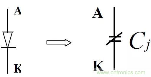 二極管反向截止時(shí)可用一電容等效,其容量與所加的反向電壓、環(huán)境溫度等有關(guān),大小可從制造商的手冊(cè)中獲得。