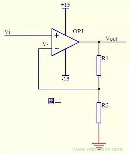 圖二中Vi與V-虛短,則 Vi = V- ……a 因?yàn)樘摂啵聪蜉斎攵藳](méi)有電流輸入輸出,通過(guò)R1和R2 的電流相等,設(shè)此電流為I,由歐姆定律得: I = Vout/(R1+R2) ……b Vi等于R2上的分壓, 即:Vi = I*R2 ……c 由abc式得Vout=Vi*(R1+R2)/R2 這就是傳說(shuō)中的同向放大器的公式了。