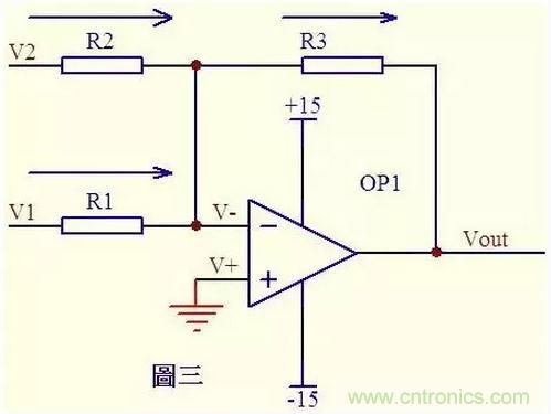 圖三中,由虛短知: V- = V+ = 0 ……a 由虛斷及基爾霍夫定律知,通過(guò)R2與R1的電流之和等于通過(guò)R3的電流, 故 (V1 – V-)/R1 + (V2 – V-)/R2 = (Vout – V-)/R3 ……b 代入a式,b式變?yōu)閂1/R1 + V2/R2 = Vout/R3 如果取R1=R2=R3,則上式變?yōu)閂out=V1+V2,這就是傳說(shuō)中的加法器了。