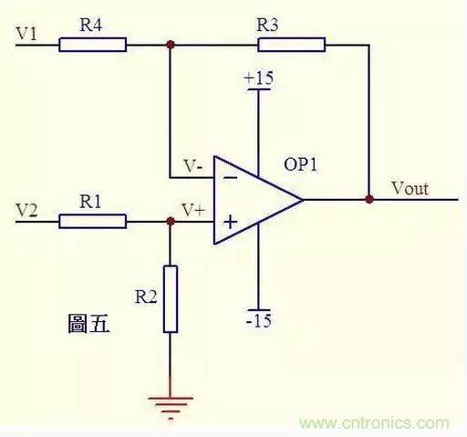 圖五由虛斷知,通過(guò)R1的電流等于通過(guò)R2的電流,同理通過(guò)R4的電流等于R3的電流,故有 (V2 – V+)/R1 = V+/R2 ……a (V1 – V-)/R4 = (V- - Vout)/R3 ……b 如果R1=R2, 則V+ = V2/2 ……c 如果R3=R4, 則V- = (Vout + V1)/2 ……d 由虛短知 V+ = V- ……e 所以 Vout=V2-V1 這就是傳說(shuō)中的減法器了。