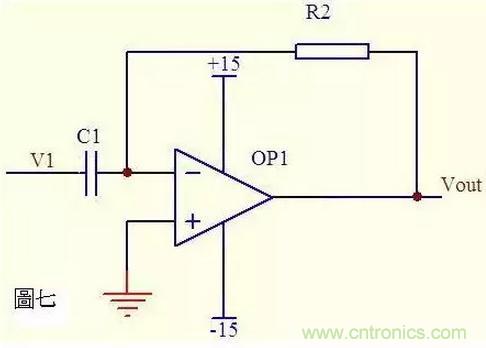 圖七中由虛斷知,通過(guò)電容C1和電阻R2的電流是相等的,由虛短知,運(yùn)放同向端與反向端電壓是相等的。則: Vout = -i * R2 = -(R2*C1)dV1/dt 這是一個(gè)微分電路。如果V1是一個(gè)突然加入的直流電壓,則輸出Vout對(duì)應(yīng)一個(gè)方向與V1相反的脈沖。