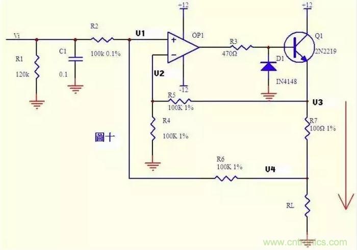 電流可以轉(zhuǎn)換成電壓,電壓也可以轉(zhuǎn)換成電流。圖十就是這樣一個(gè)電路。上圖的負(fù)反饋沒(méi)有通過(guò)電阻直接反饋,而是串聯(lián)了三極管Q1的發(fā)射結(jié),大家可不要以為是一個(gè)比較器就是了。只要是放大電路,虛短虛斷的規(guī)律仍然是符合的!