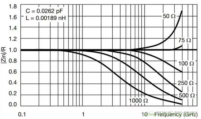 上圖電阻的高頻特性非常好,可以看到極間電容只有0.03pF,引線電感只有0.002nH,其中75Ω的電阻可以到30GHz。我們通常使用的貼片電阻大都是厚膜電阻,性能遠(yuǎn)達(dá)不到如此,其引線電感有幾個nH,極間電容也有幾個pF,大多只能用到幾百M(fèi)Hz或幾個GHz。