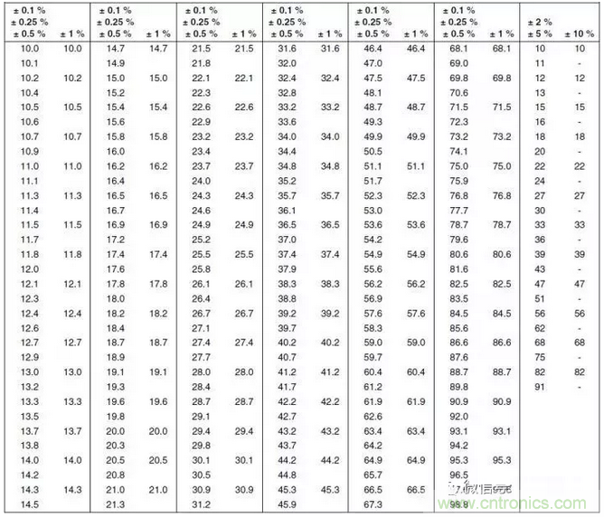 通常電阻阻值都是標(biāo)準(zhǔn),上圖給出了不同精度(容差)的電阻的標(biāo)準(zhǔn)阻值,通常乘以10的倍數(shù)或除以10的倍數(shù),就可以得到所有阻值。