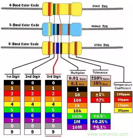 從左往右,前兩個或三個環(huán)代表數(shù)字,接下來的環(huán)代表乘數(shù),與前面的數(shù)字相乘便是阻值。再接下來的環(huán)代表電阻的容差,最后就是電阻的溫度系數(shù)。
