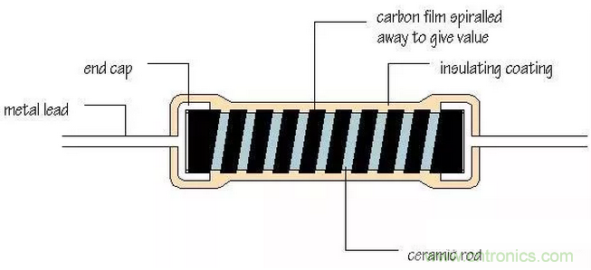 碳膜電阻主要是在陶瓷棒上形成一層碳混合物膜,例如直接涂一層,碳膜的厚度和其中碳濃度可以控制電阻的大小;為了更加精確的控制電阻,可以在碳膜上加工出螺旋溝槽,螺旋越多電阻越大;最后加金屬引線,樹脂封裝成型。碳膜電阻的工藝更加復(fù)雜一點(diǎn),可以做精密電阻,但由于碳質(zhì)的原因,還是溫度特性不太好。