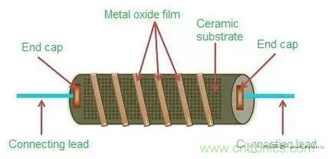 與金屬膜電阻結(jié)構(gòu)類似,金屬氧化物膜主要是在陶瓷棒形成一層錫氧化物膜,為了增加電阻,可以在錫氧化物膜上加一層銻氧化物膜,然后在氧化物膜上加工出螺旋溝槽來精確控制電阻。金屬氧化物膜電阻最大的優(yōu)勢就是耐高溫。