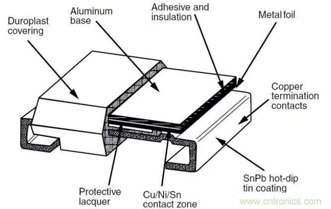 將氧化鋅陶瓷采用和MLCC類似的工藝制作成多層型壓敏電阻,即 MLV。MLV封裝較小,通常是片狀的,額定電壓和通流能力都比MOV小很多,適用于低壓直流場合。