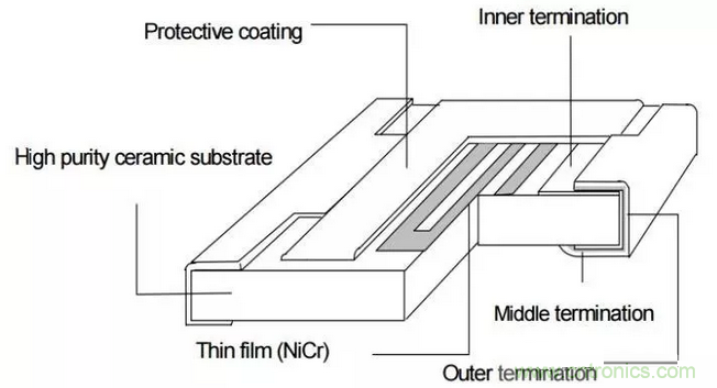 薄膜電阻就是氧化鋁陶瓷基底上通過真空沉積形成鎳化鉻薄膜,通常只有0.1um厚,只有厚膜電阻的千分之一,然后通過光刻工藝將薄膜蝕刻成一定的形狀。Thin Film工藝在此前電容和電感的文章中已經(jīng)提到過多次了,光刻工藝十分精確,可以形成復(fù)雜的形狀,因此,薄膜電容的性能可以控制的很好。