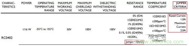 此時,就需要從電阻的規(guī)格書中獲取相關(guān)參數(shù),從下圖可以看出RC0402的零歐姆電阻,其電阻值不會超過50mΩ,額定電流不超過1A,由此就可以判斷電阻是否滿足設(shè)計要求。通常0402的零歐姆電阻都可以滿足1A以下的電流要求。