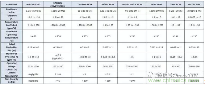 常見類型的電阻的主要參數(shù)的對比如下圖所示,出貨量最大的應(yīng)該是厚膜電阻和金屬膜電阻。