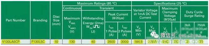 MOV的額定工作電壓,交流場合考慮交流額定電壓,即Vrms或Vm(ac),上圖中的器件可以有效值130V的交流電中正常工作。超過這個電壓,MOV可能動作或者損壞,導(dǎo)致電路無法工作。
