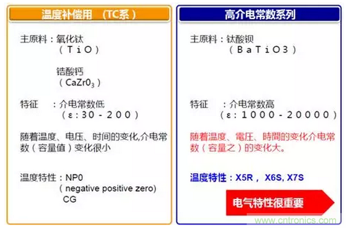 目前主流的陶瓷電容分類(lèi)主要是按材質(zhì)來(lái)分,不同的材質(zhì),會(huì)有不同的容值,有不同的溫度系數(shù)。目前主要有以下材質(zhì):X5R,X7R,C0G,NP0,X6S,X7T等,這些又可以分兩大類(lèi),溫度補(bǔ)償型和高介電常數(shù),主要是溫度系數(shù)不同,溫度補(bǔ)償型主要是容值隨溫度變化小,但是容值做不高。高介電常數(shù)型,溫度系數(shù)不好,但是容值可以做的比較高。