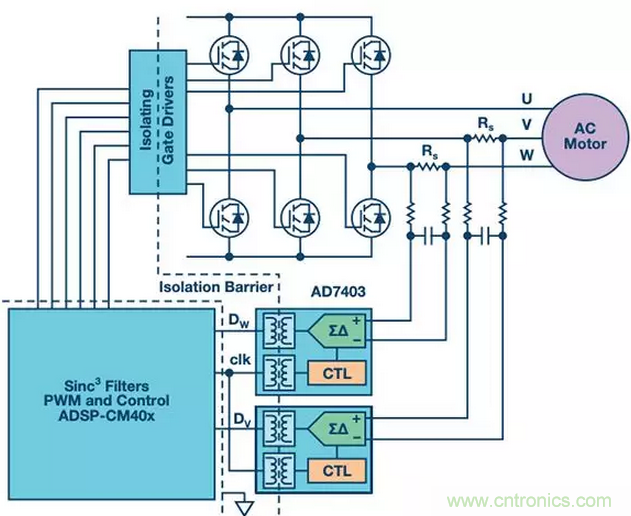 圖1所示為一個典型三相永磁電機驅動系統,其利用檢測電阻測量繞組電流,并通過ADI公司的AD7403隔離式Σ-Δ調制器和sinc3濾波器提供反饋。AD7403使用單個二階調制器數字化電路來將檢測電阻的模擬信號轉換為隔離的一位數字脈沖流,其大小取決于滿量程輸入電壓范圍。然后,sinc3濾波器提取電流平均值,同時消除逆變器開關產生的噪聲。其存儲器可以存儲一個代表電流的16位整數,與此同時,它可以將該數值與一個代表電流限值的基準值相比較,如果發生過載,它就會通過單獨的引腳發送警報。利用更短的濾波器監控過載,并將其與測量濾波器并聯,可以縮短警報延遲時間。