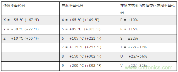 舉個列子,一個代碼為Z5U的電容工作溫度范圍為+10°C 到 +85 °C,容差為+22% 到 -56%;一個X7R的電容的工作溫度為-55°C 到 +125 °C,容差為±15%。