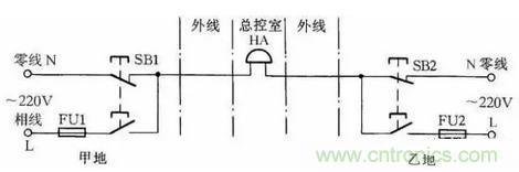 圖23所示線路可使甲乙兩地都能向總控制室發聯絡信號。當甲地向總控制室發信號時,按下按鈕SB1,控制室的電鈴告警。同理當乙地向總控制室發信號時按下SB2即可。甲乙兩地信號可用信號鈴聲的時間長短或次數區分。