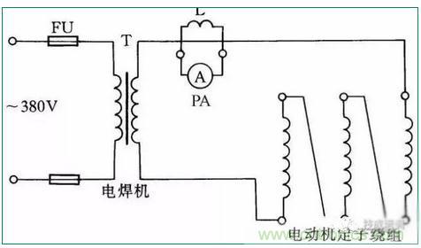 通入電動機繞組線圈的電流可由電焊機來調節,但在烘干時應注意通入電動機的電流不能超過電動機本身額定電流太多,并且注意觀察電動機和電焊機溫度都不能升得過高。線路參見圖31。