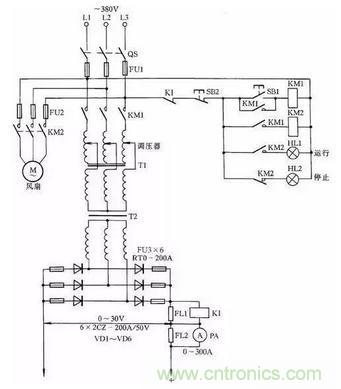 電路中VD1~VD4為4只硅整流二極管;R1~R4、C1~C4組成硅整流器件的過壓保護電路;FR為過流繼電器,保護硅整流器件。當負載電流超過額定值時,電流互感器次級電流相應增加,帶動繼電器FR動作,FR常閉觸點打開,接觸器KM釋放,觸點打開切斷電焊機電源。硅整流器件用0.25kW風扇作風冷設備。圖中,C5為濾波電容,R5為泄放電阻。