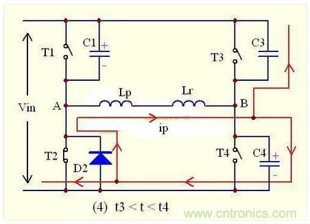 由于T4的關(guān)斷,原邊電流ip突然失去通路,但由電感的原理我們知道,原邊電流不允許突變,需要維持原來的方向,以一定的速率減少。所以,原邊電流ip會對C4充電,使C4兩端的電壓慢慢往上升,同時抽走C3兩端的電荷。