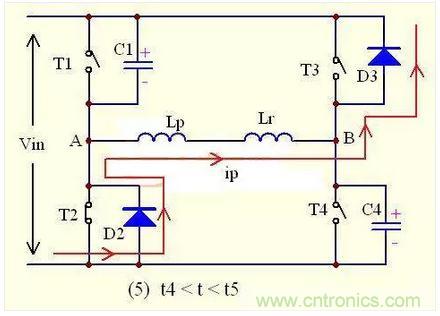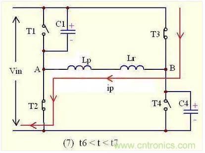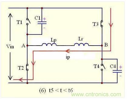 在t5-t6的時間內(nèi),副邊的二極管D1,D2還是同時導(dǎo)通流過電流,將副邊繞組短路,阻斷輸出電感反射到初級的途徑,此時的負(fù)載電流還是由次級電感與輸出電容提供;同時,由于原邊的T2,T3已經(jīng)導(dǎo)通,原邊電流ip流過T3--Lr--T2,又因為Lr很小,所以原邊電流ip就會反向急劇增大。