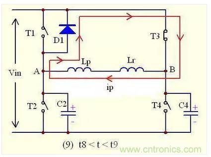 其中Ip是在模態(tài)8流過原邊電感的電流,在t8時刻之前,C2上的電壓很快上升到Vin,C1上的電壓很快變成0V,D1開始導(dǎo)通。