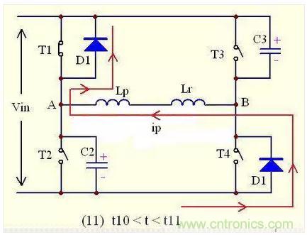 如圖所示,在t11時刻之前,T4已經(jīng)導(dǎo)通,在t11時刻原邊電流ip已經(jīng)上升到0,由于沒有了電流,所以D1,D4自然關(guān)斷。