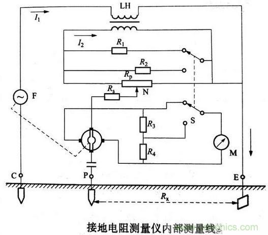 接地電阻測量儀由手搖發(fā)電機F、電流互感器LH、倍率開關(guān)S、調(diào)節(jié)電位器Rp及檢流計M等組成,全部機構(gòu)裝在塑料殼內(nèi),外有皮殼便于攜帶,附件有輔助探棒、導線等,其內(nèi)部測量線路如下圖所示。