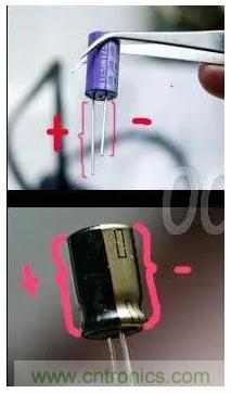 對于直插的有極性的電容來說,好分辨,長腿為正,短腿為負。電解電容有黑色標志的為負,也對應著短腿。