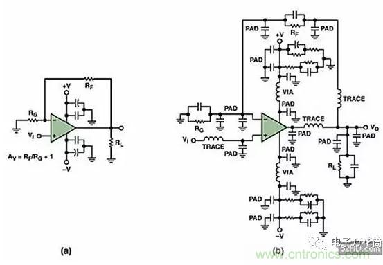 所謂寄生效應,按照字面意思就是那些出現在PCB板中并在電路中大施破壞、令人頭痛且原因不明的小故障。它們就是滲入高速電路中隱藏的寄生電容和寄生電感。其中包括由封裝引腳和印制線過長所形成的寄生電感;焊盤(pad)到地、焊盤到電源平面和焊盤到印制線之間形成的寄生電容;通孔之間的相互影響,以及許多其他可能的寄生效應。(圖三)(a)顯示一個典型的同相運算放大器原理圖。但是,如果考慮寄生效應的話,同樣的電路可能會變成圖三(b)那樣。