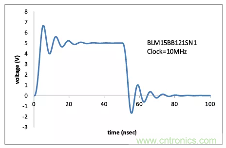 圖2:片狀鐵氧體磁珠造成過沖和下沖的示例