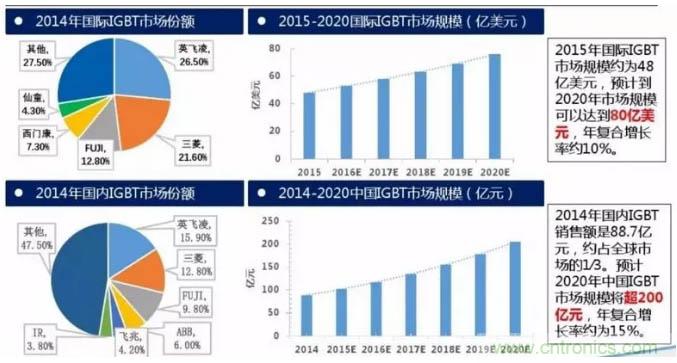 2015年國際IGBT市場規模約為48億美元,預計到2020年市場規模可以達到80億美元,年復合增長率約10%。2014年國內IGBT銷售額是88.7億元,約占全球市場的1∕3。預計2020年中國IGBT市場規模將超200億元,年復合增長率約為15%。