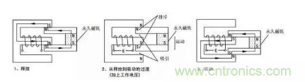 由永久磁鐵保持釋放狀態(tài),加上工作電壓后,電磁感應(yīng)使銜鐵與永久磁鐵產(chǎn)生吸引和排斥力矩,產(chǎn)生向下的運(yùn)動(dòng),最后達(dá)到吸合狀態(tài)。