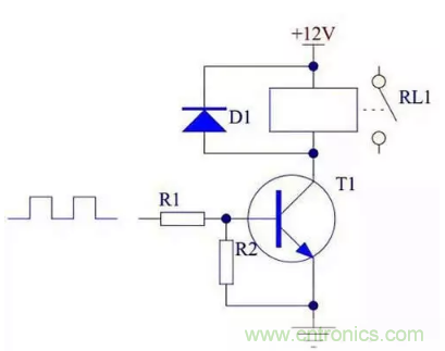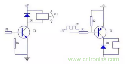 當(dāng)晶體管用來驅(qū)動(dòng)繼電器時(shí),必須將晶體管的發(fā)射極接地。具體電路如下: