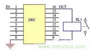 當(dāng)2003輸入端為高電平時(shí),對應(yīng)的輸出口輸出低電平,繼電器線圈兩端通電,繼電器觸點(diǎn)吸合;當(dāng)2003輸入端為低電平時(shí),對應(yīng)的輸出口呈高阻態(tài),繼電器線圈兩端斷電,繼電器觸點(diǎn)斷開。